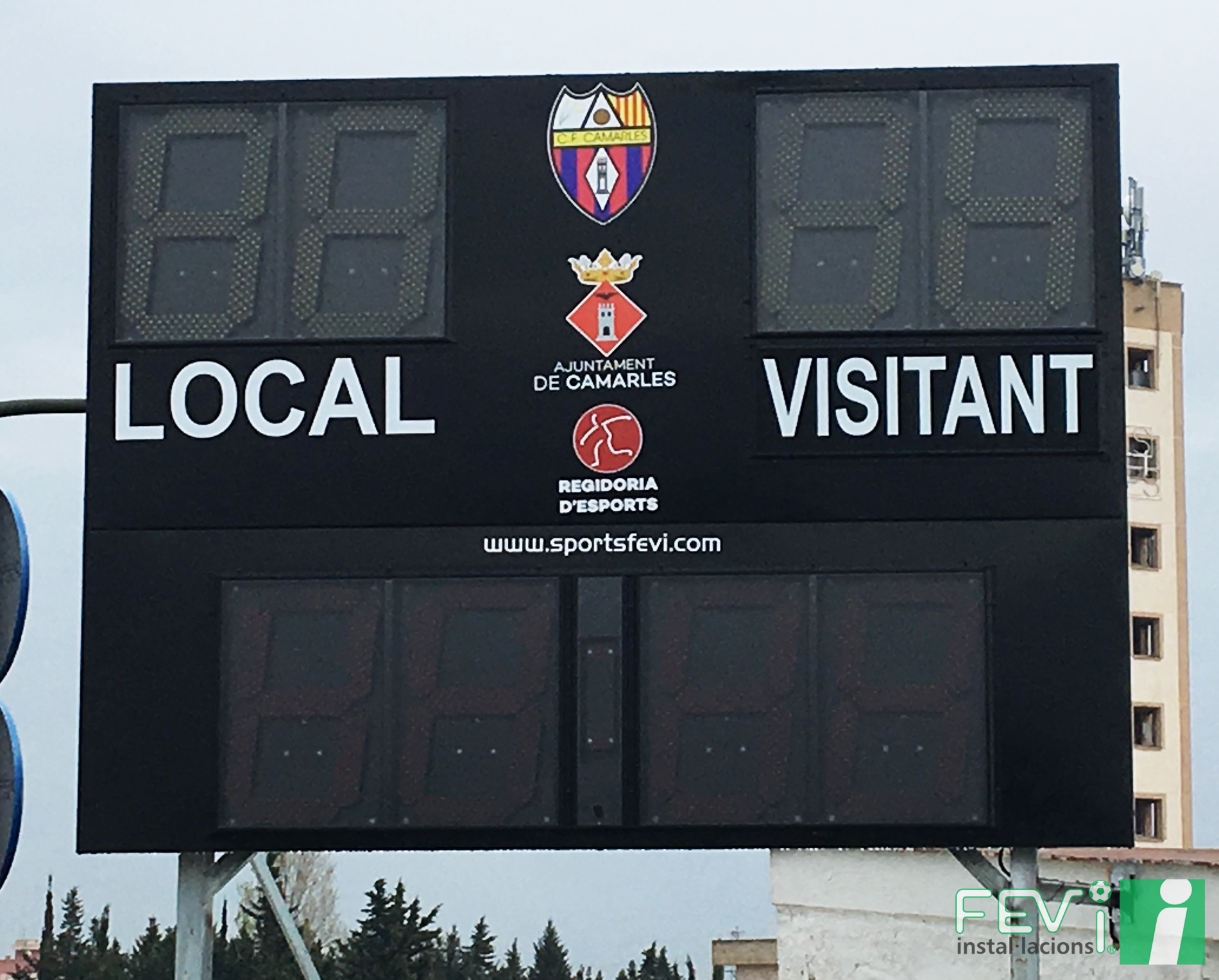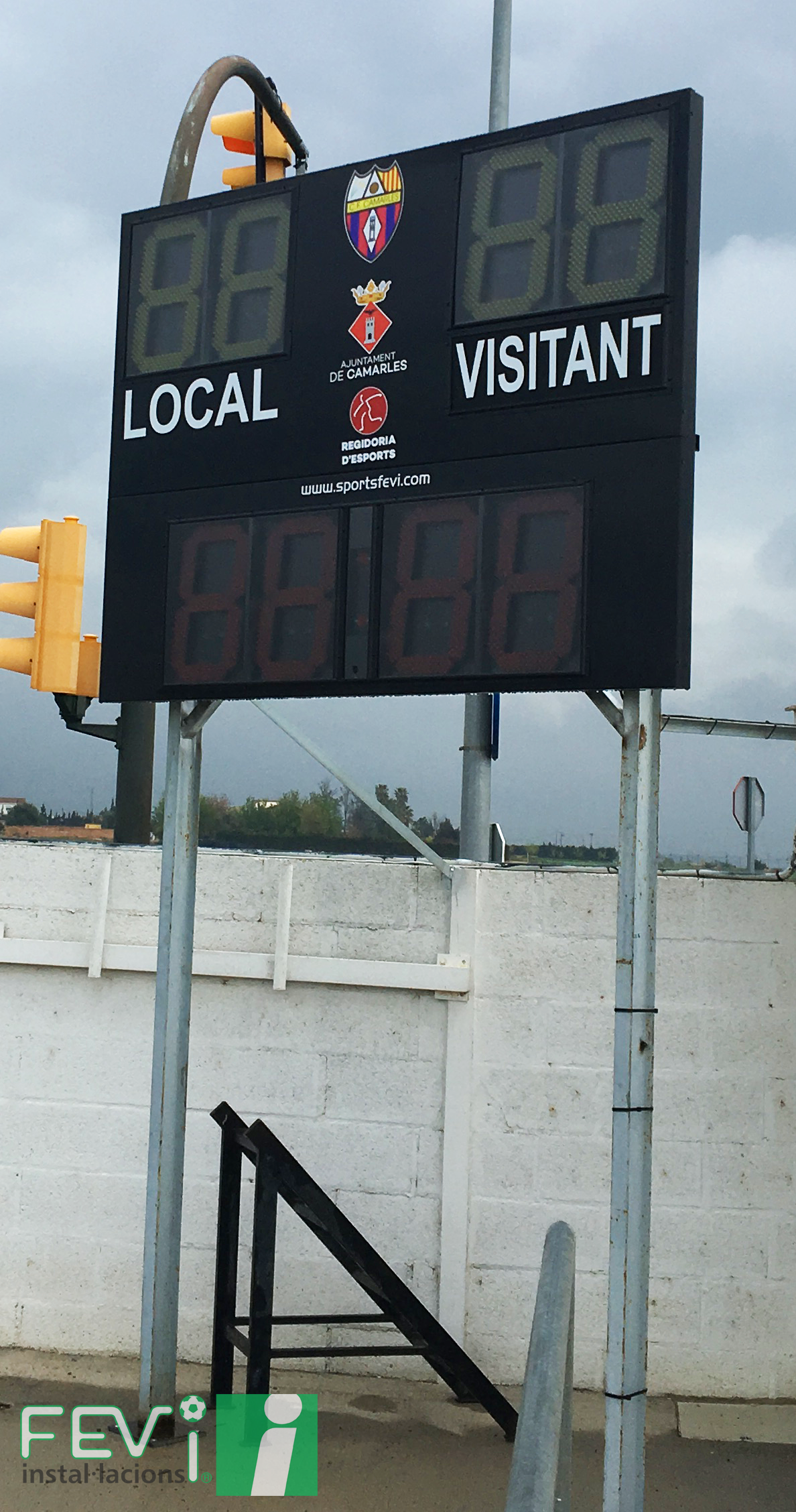 Éste es el nuevo marcador suministrado para el campo de fútbol de Camarles (Tarragona), con caja metálica imprimada en negro mate especial para exterior y dígitos led rojo/ambar de 45 cm visibles a 180 metros. El control se realiza por radiofrecuencia desde consola remota informando de tiempo y tanteo. Se personalizó con los logotipos de club y entidades deportivas locales.