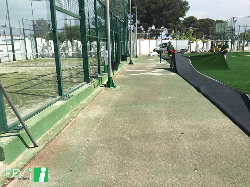 Nuestra gama de césped artificial deportivo engloba también los especificos para pádel y tenis. Las imágenes corresponden a la instalación de césped en las pistas del Club de Tenis La Plana en Santa Bárbara  (Tarragona) y la posterior carga de sílice para conseguir las propiedades adecuadas de amortiguación y bote de la pelota.