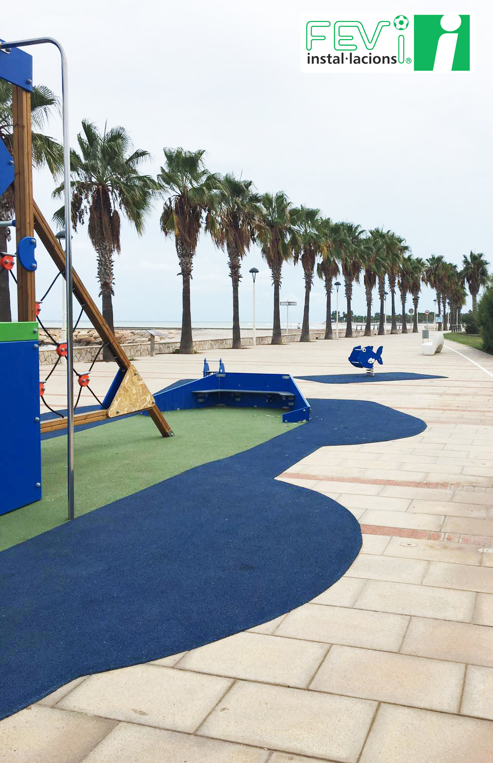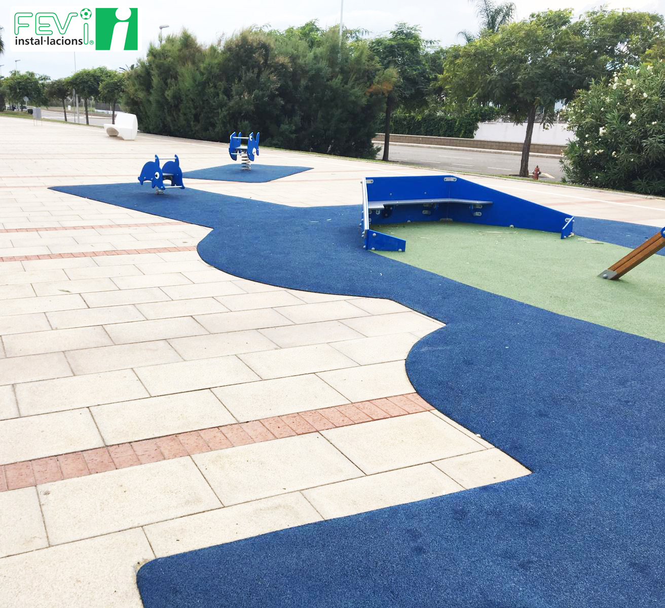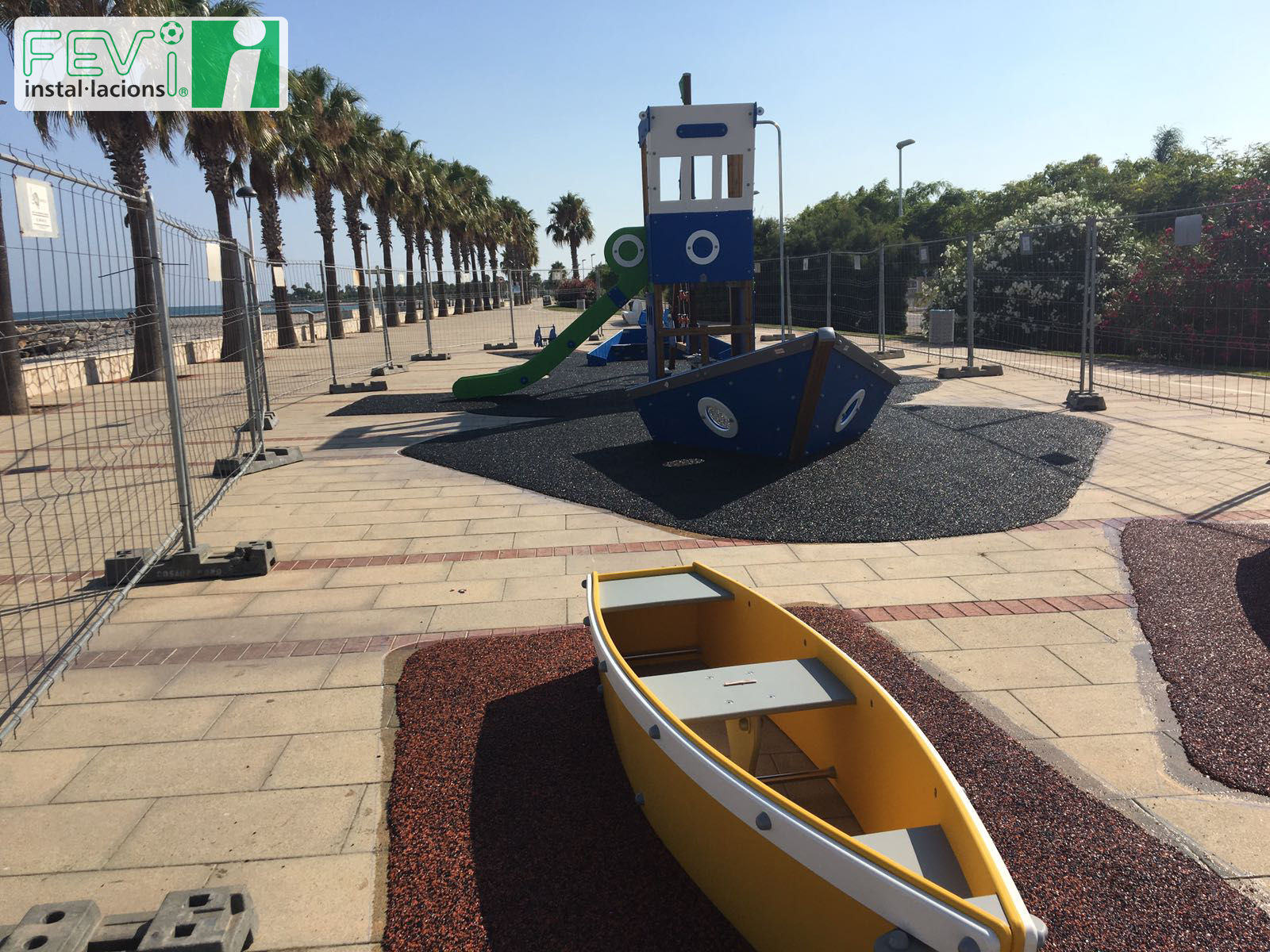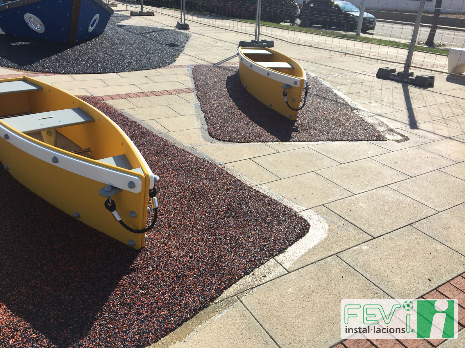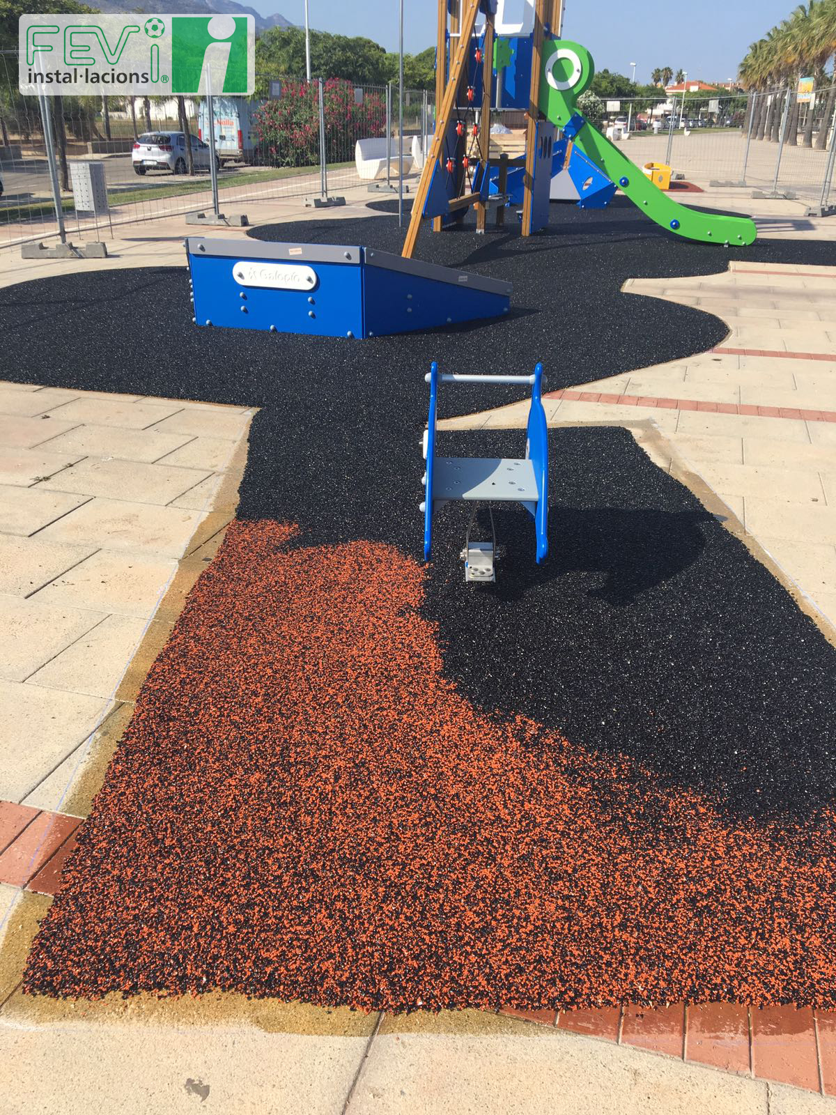 Una opción para aumentar la seguridad de parques infantiles ya instalados como éste en Les Cases d’Alcanar (Tarragona), es añadir un suelo de seguridad de caucho, que evitará lesiones en caso de caída. Se puede instalar en losetas independientes o, como es el caso de las imágenes, mediante la aplicación del caucho “in situ”.