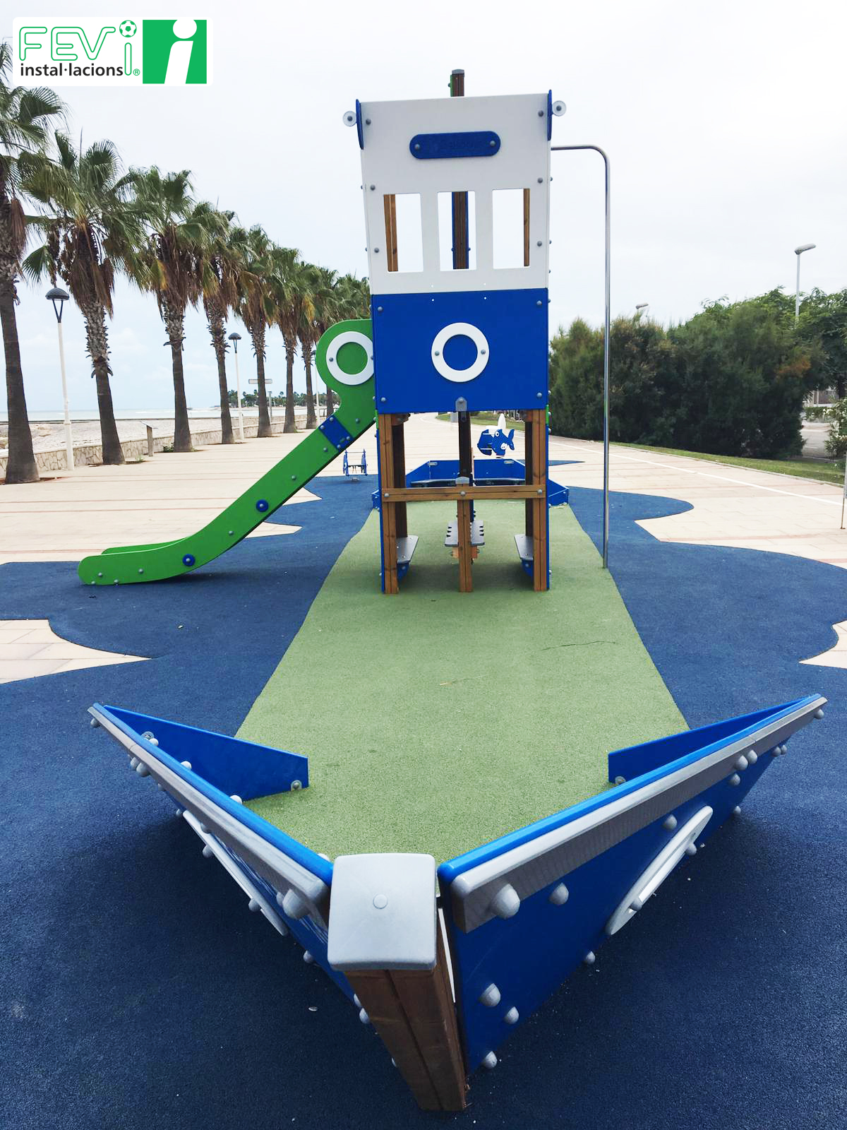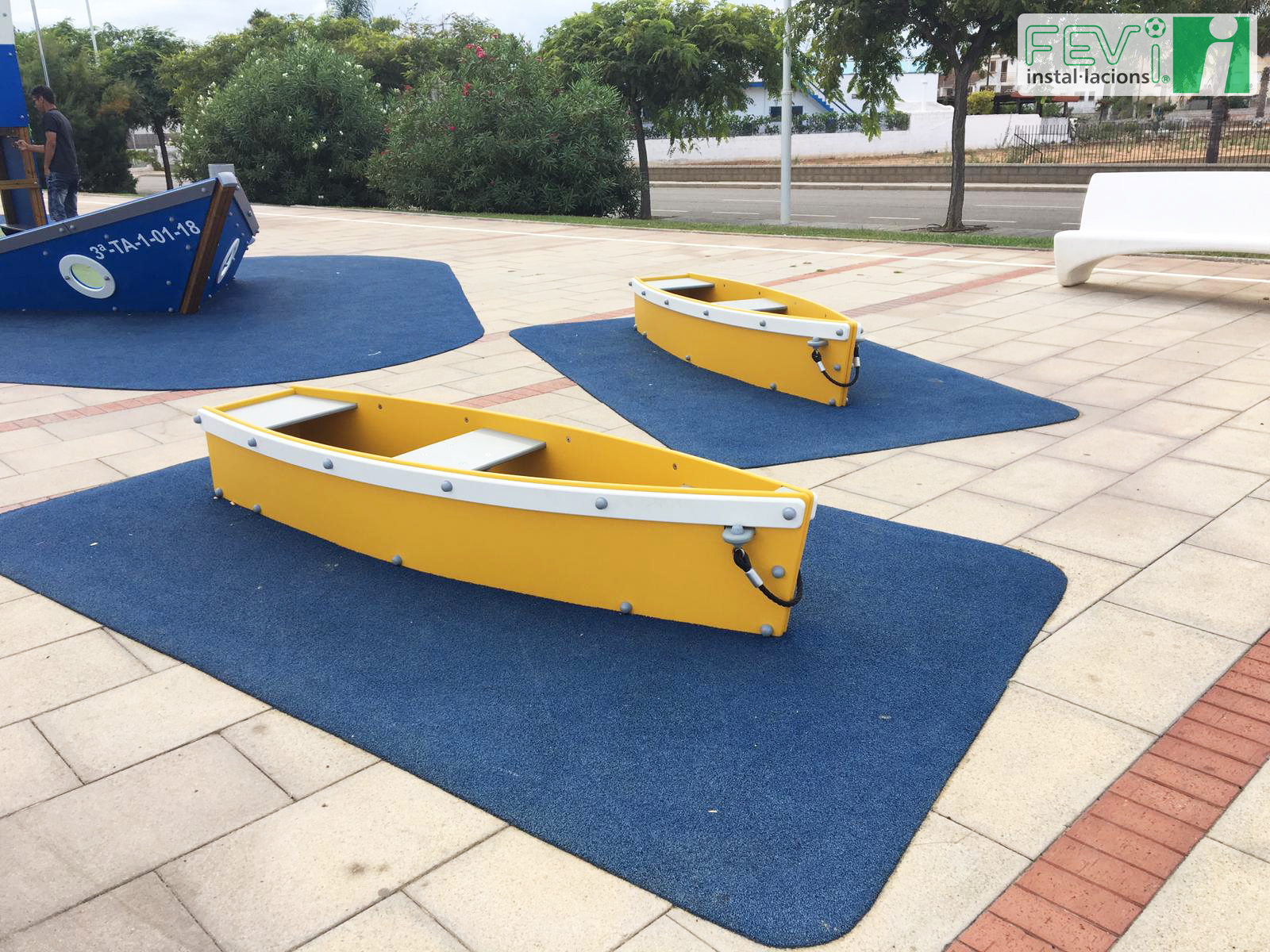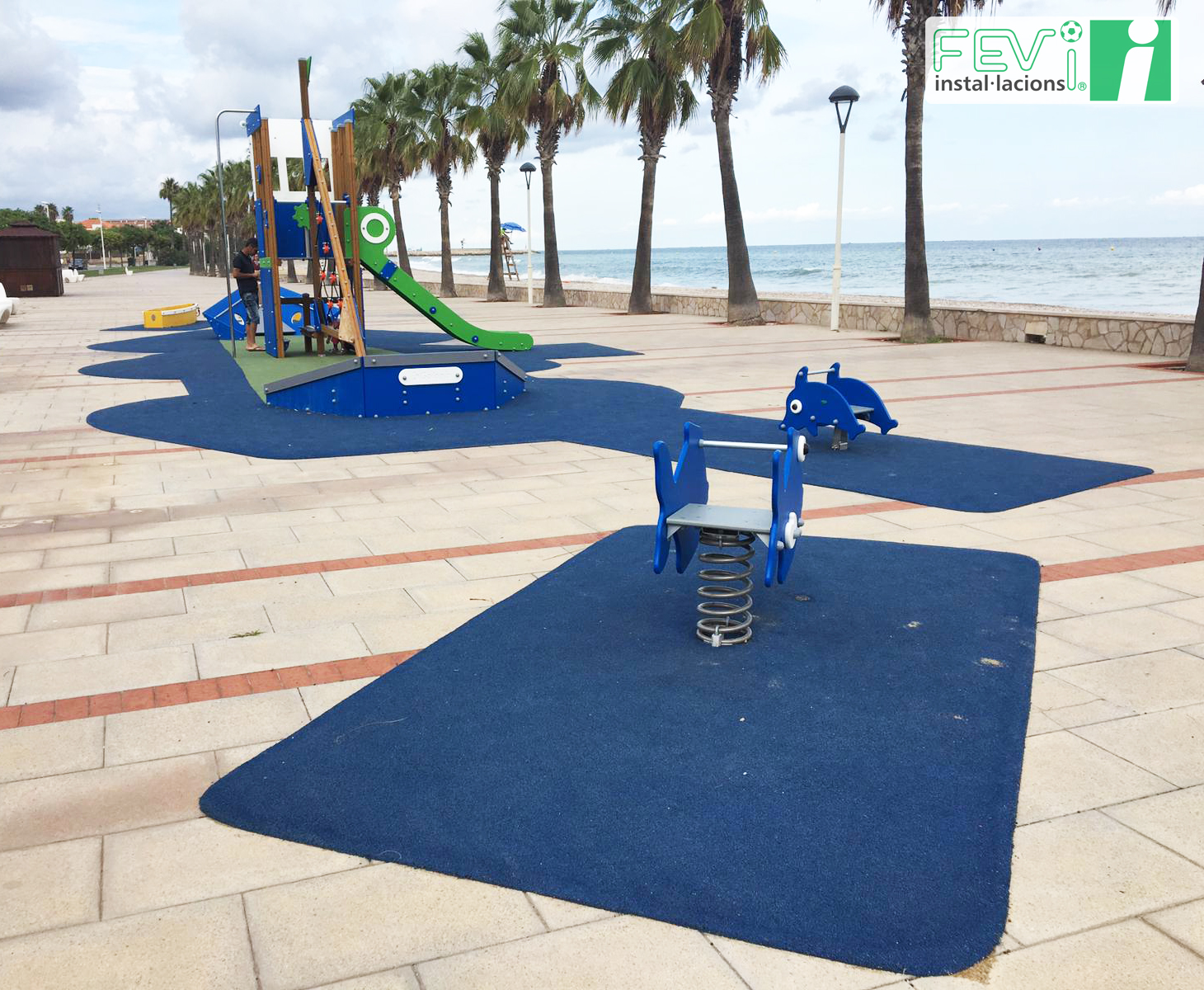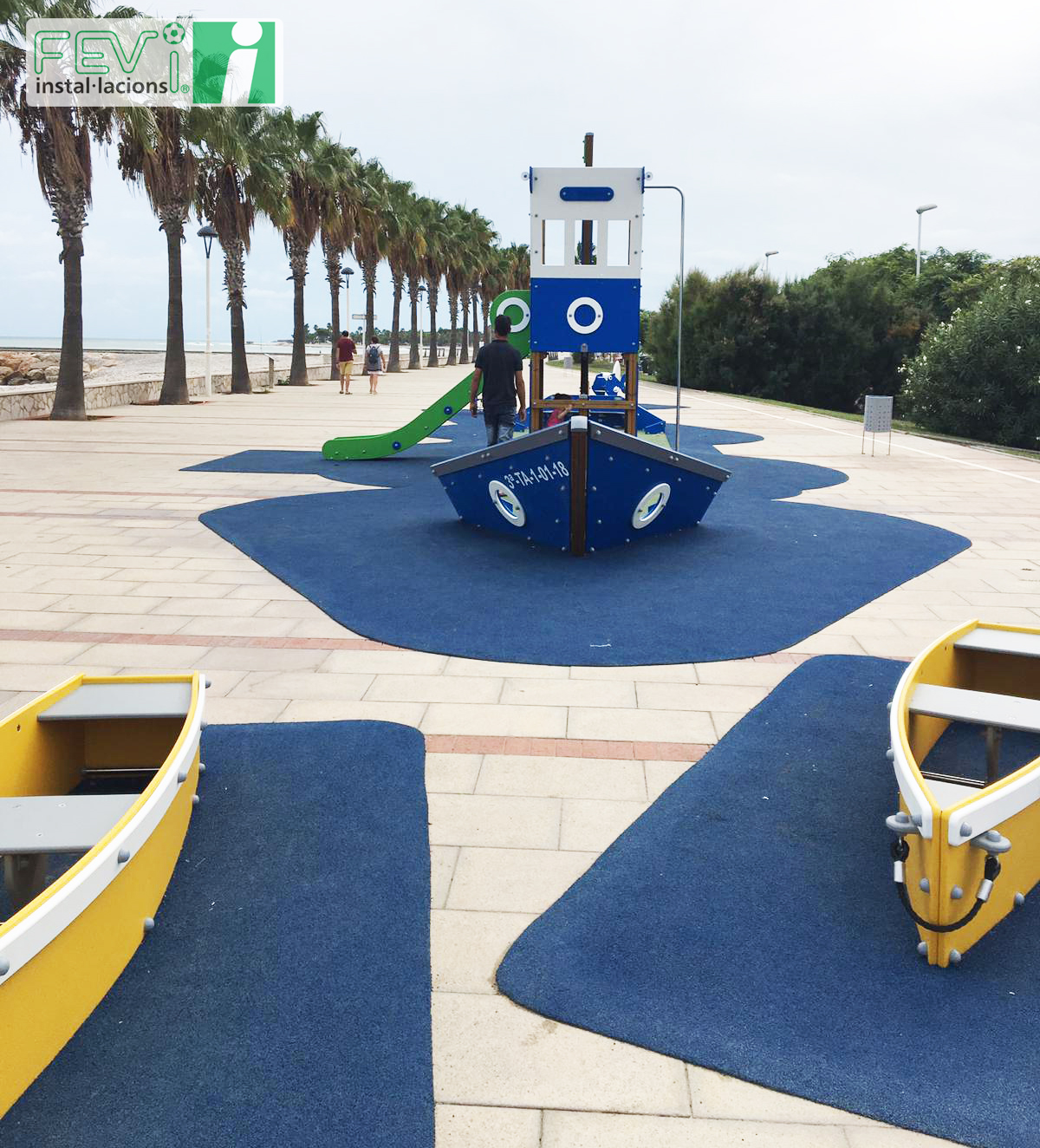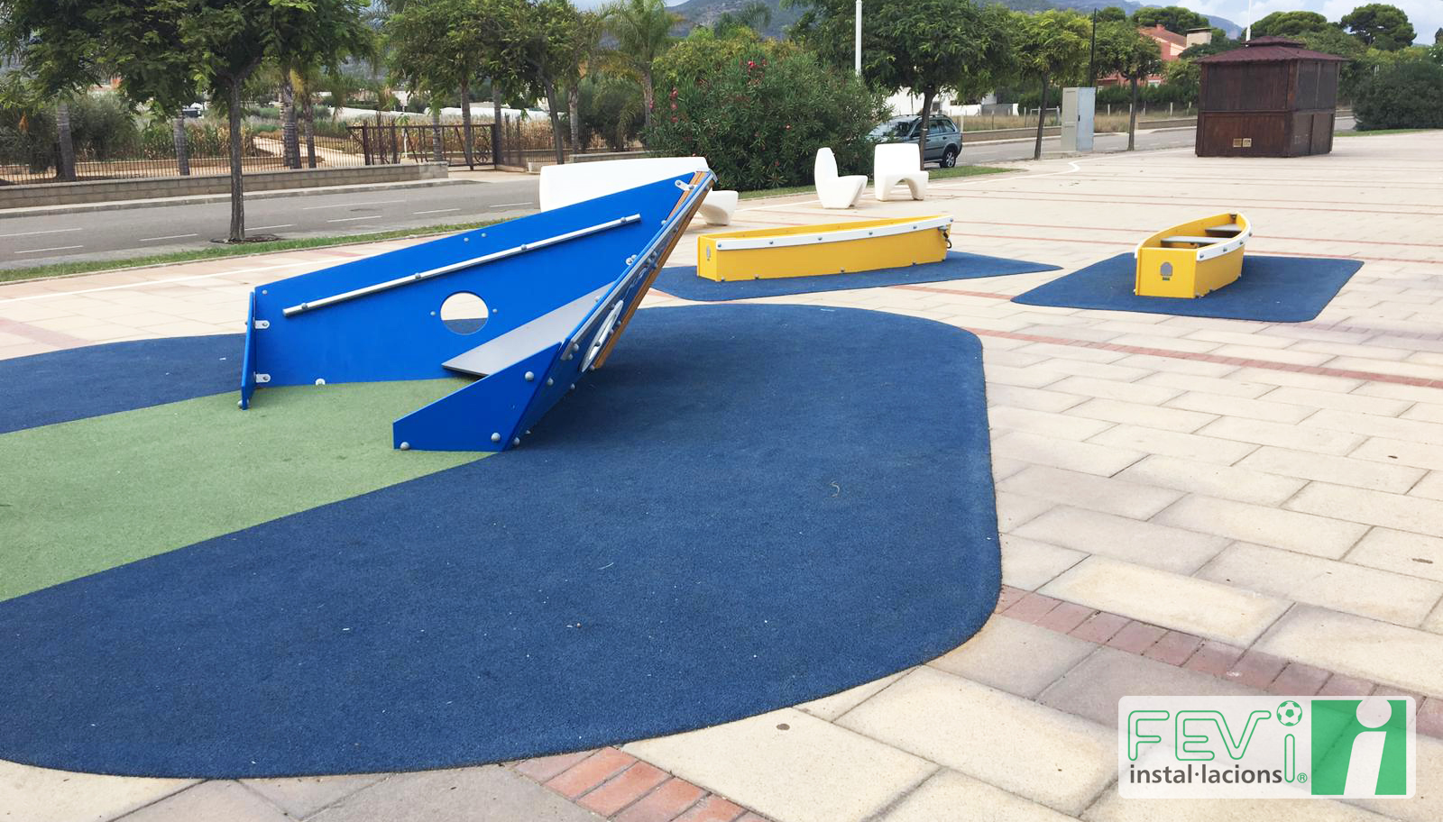 Una opción para aumentar la seguridad de parques infantiles ya instalados como éste en Les Cases d’Alcanar (Tarragona), es añadir un suelo de seguridad de caucho, que evitará lesiones en caso de caída. Se puede instalar en losetas independientes o, como es el caso de las imágenes, mediante la aplicación del caucho “in situ”.