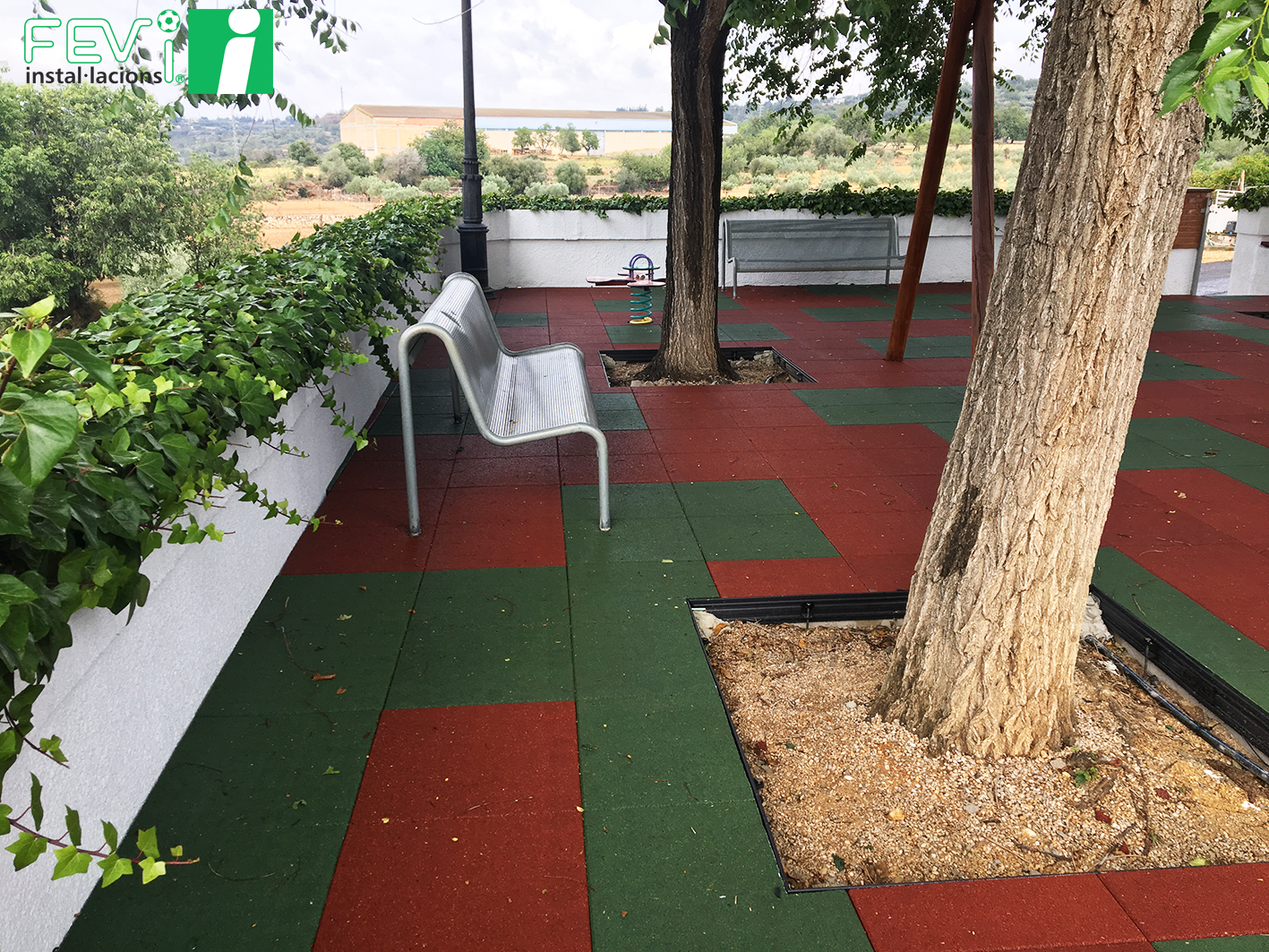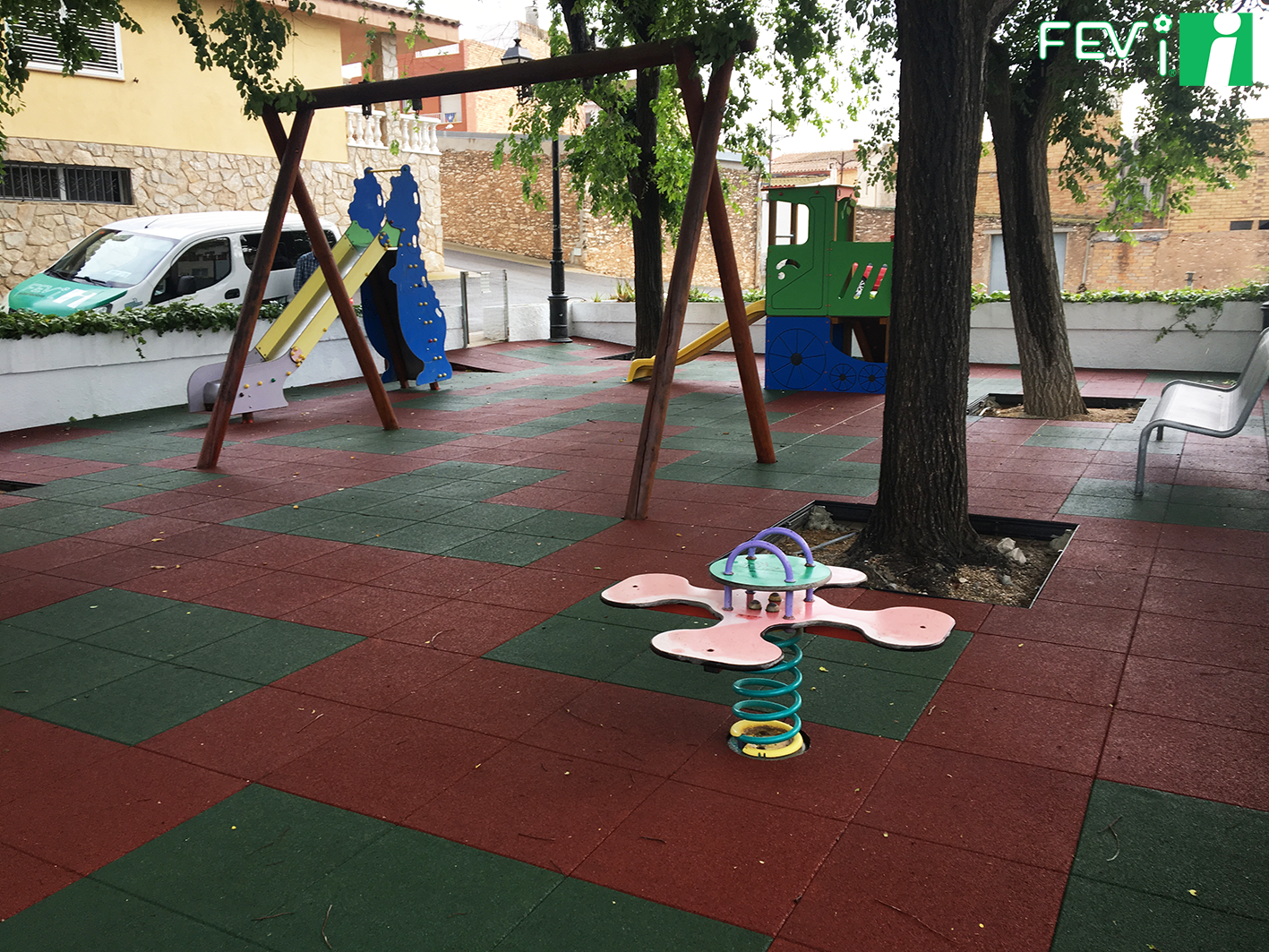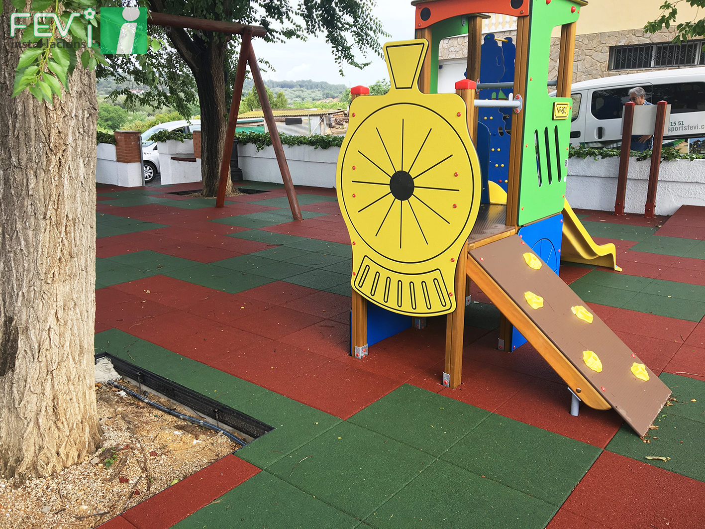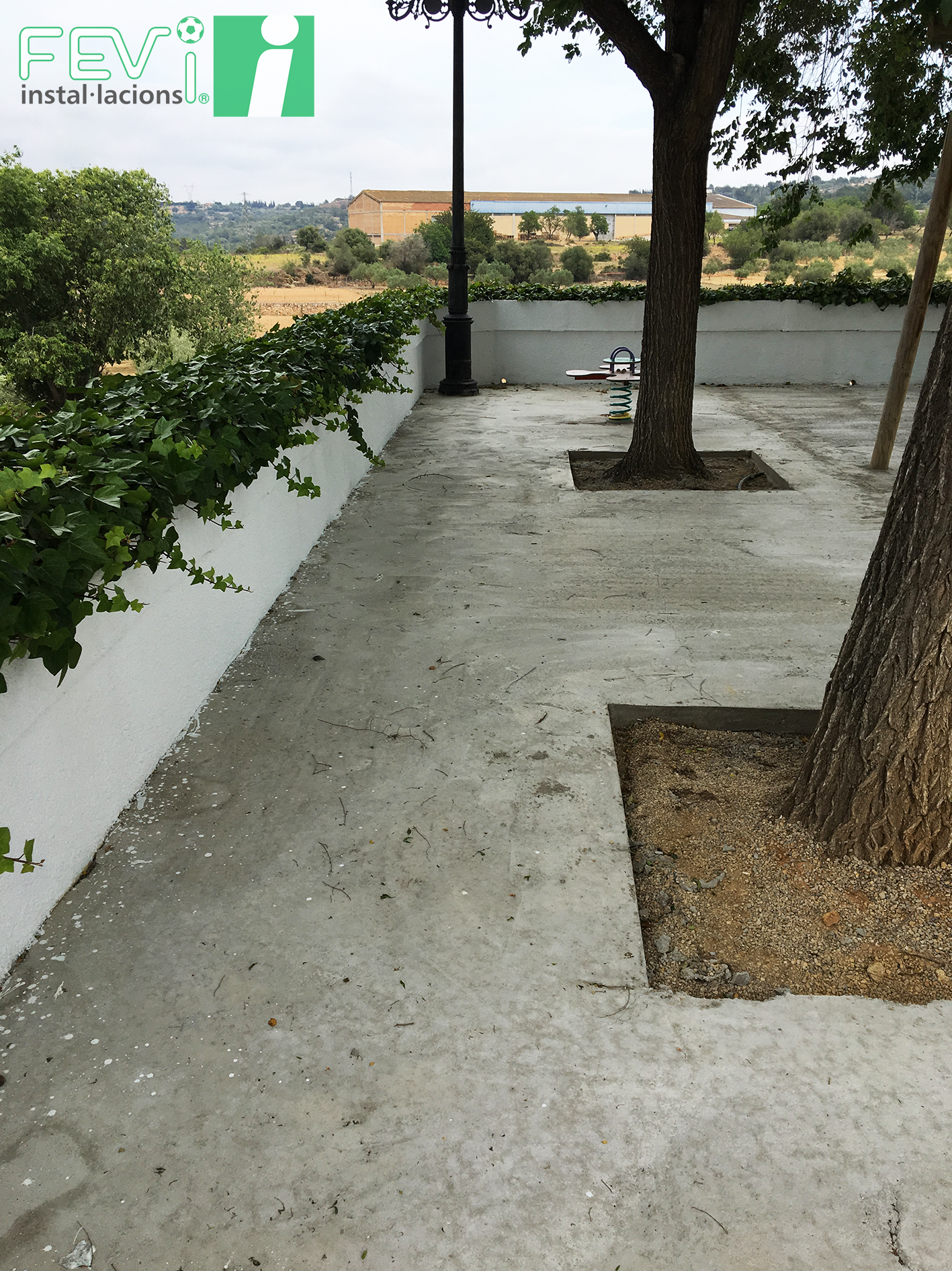 Está situado en una plaza elevada originalmente con grava en el firme. Se retiraron los columpios originales para poder hacer una solera de cemento donde poder instalar suelo de caucho de seguridad y alcorques para proteger el perímetro de los árboles.