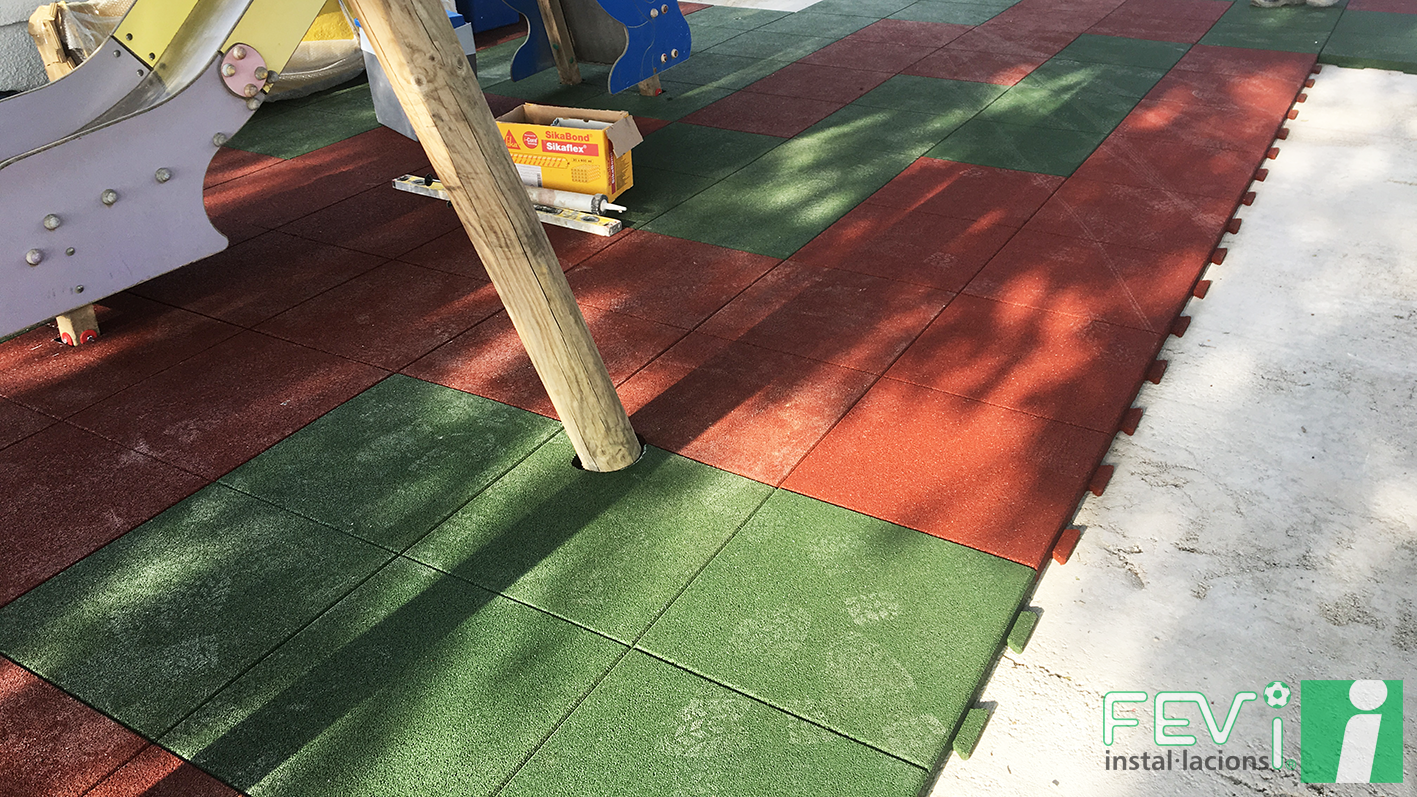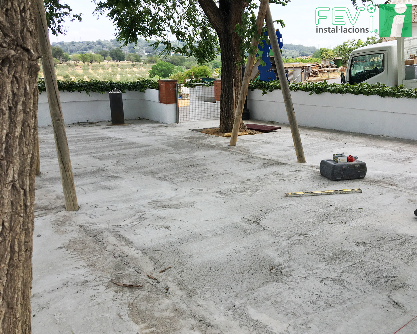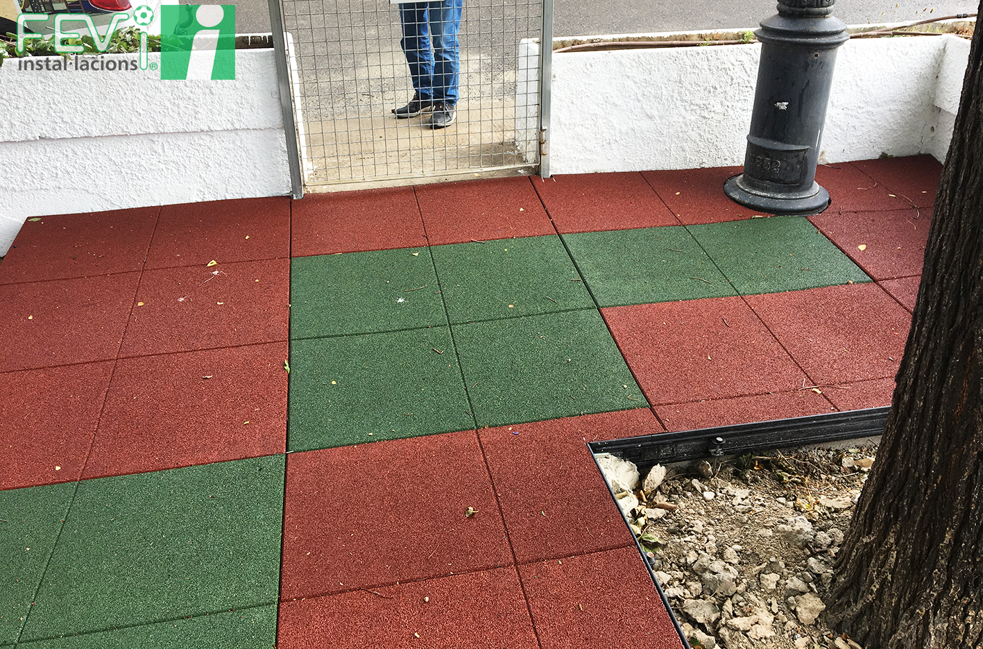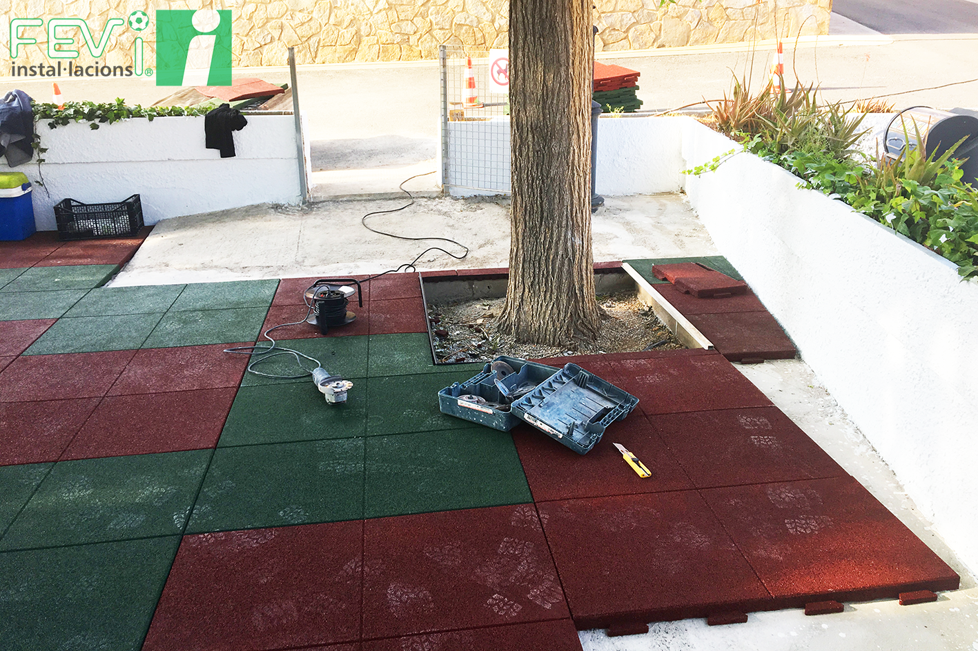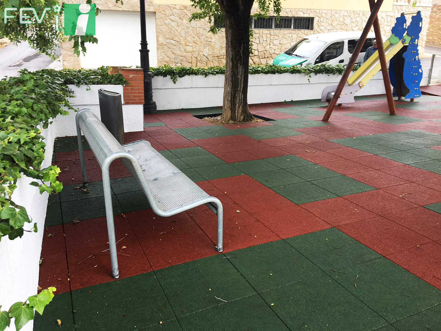 Está situado en una plaza elevada originalmente con grava en el firme. Se retiraron los columpios originales para poder hacer una solera de cemento donde poder instalar suelo de caucho de seguridad y alcorques para proteger el perímetro de los árboles.