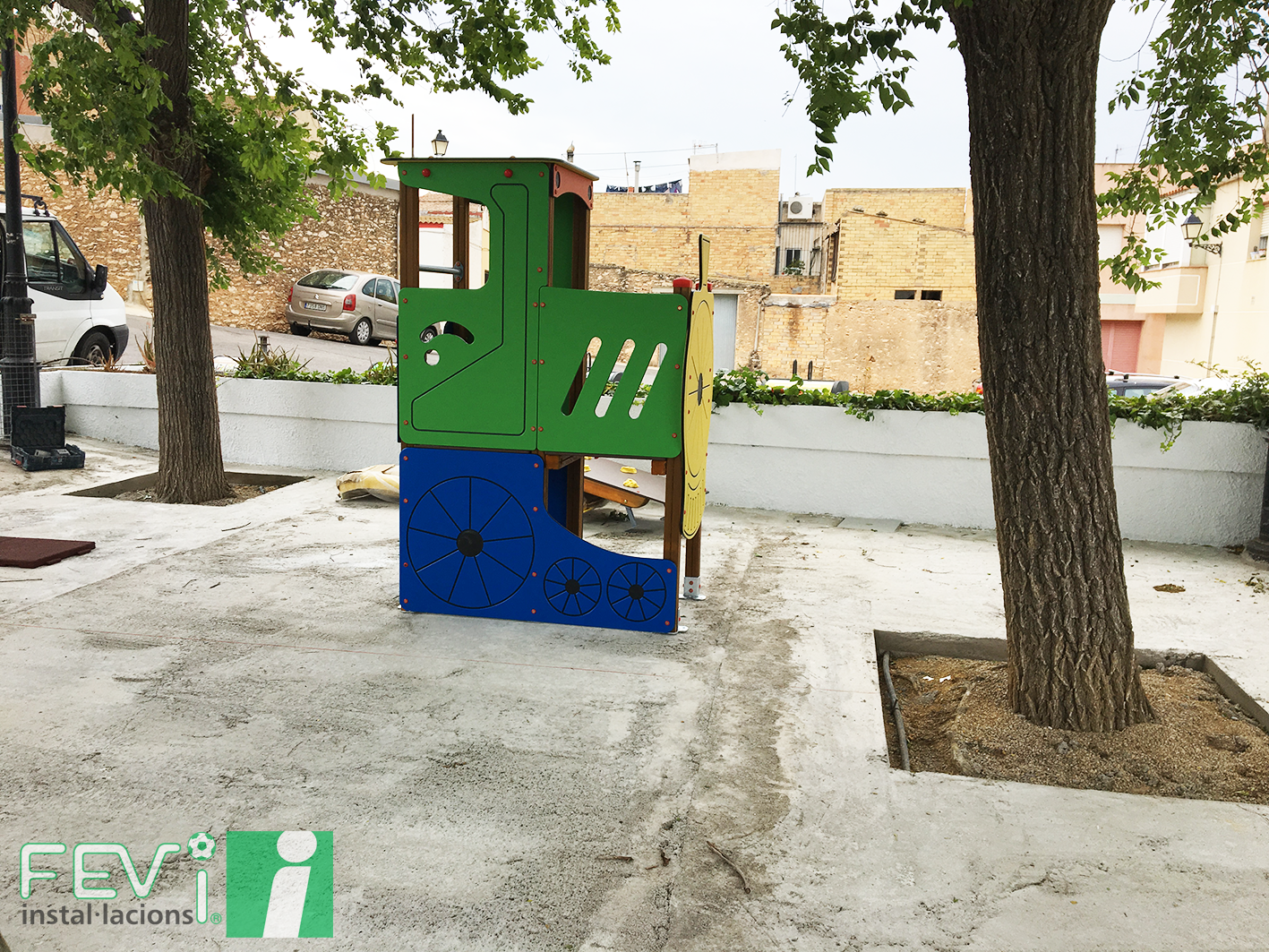 Se restauró la fuente y juegos originales, sustituyendo unos de ellos por un conjunto “locomotora” adaptado para que puedan jugar los más pequeños