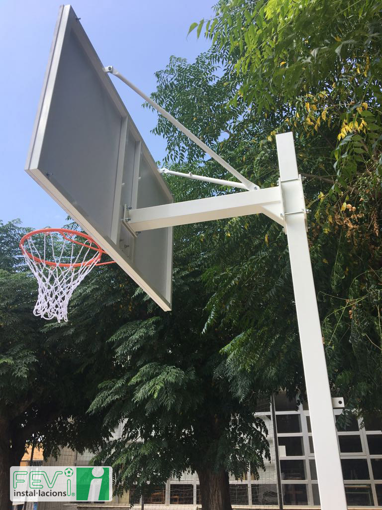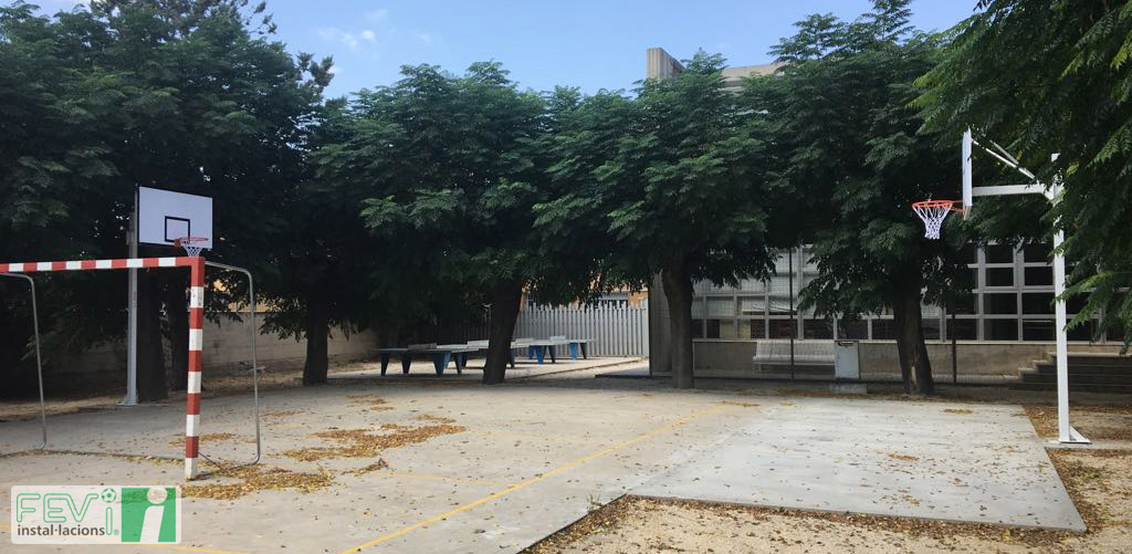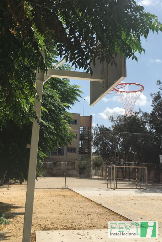 Éstas son las nuevas canastas fijas del Instituto Dertosa en Tortosa (Tarragona). Su sección de tubo 100×100 anclada con doble sistema de tuercas de nivelación y sus tirantes superiores, consiguen la máxima estabilidad para su vuelo de 1’65 metros. El tablero fabricado en pvc espumado recubierto de vinilo está preparado para la máxima resistencia al exterior.