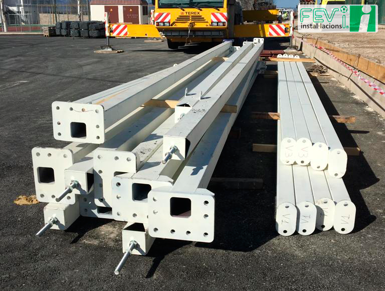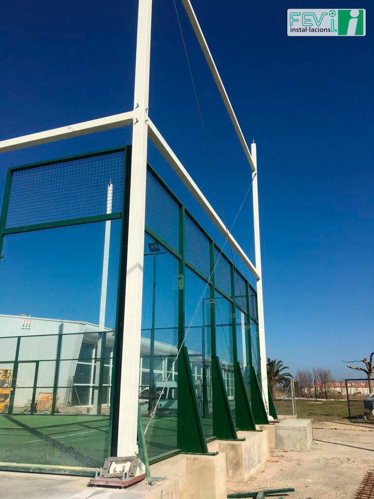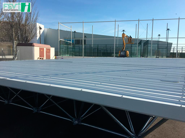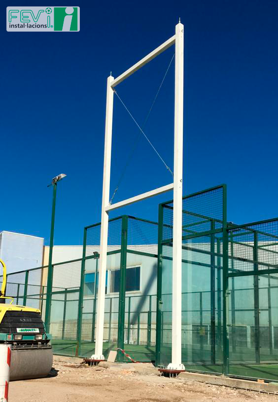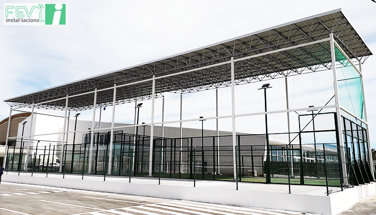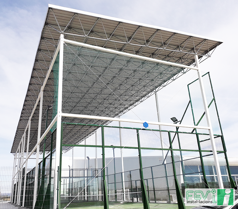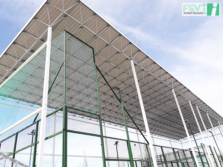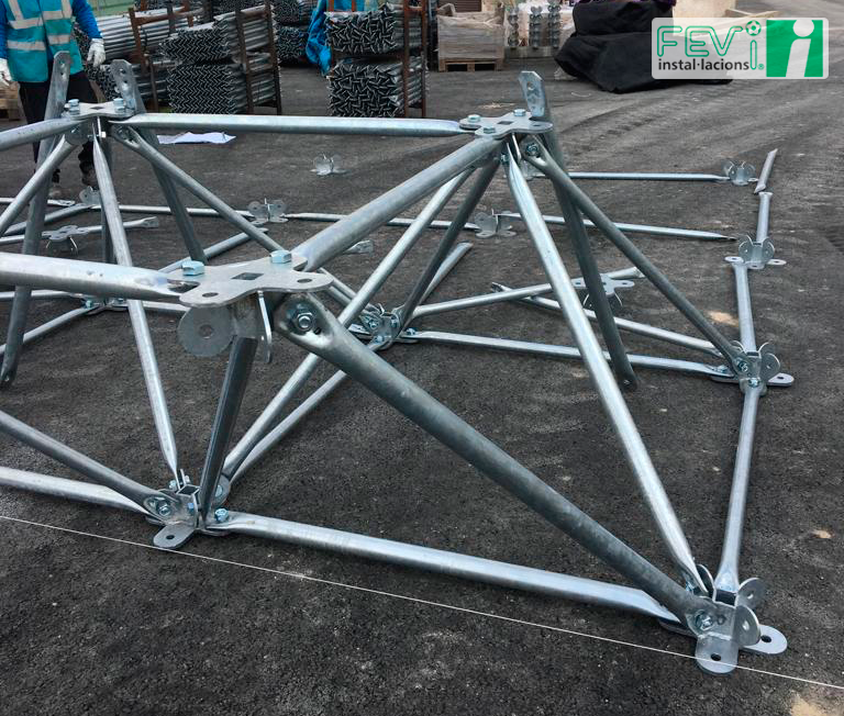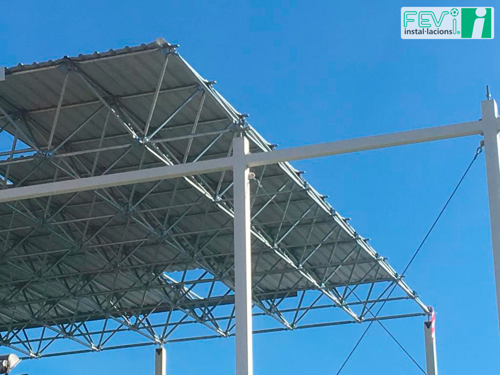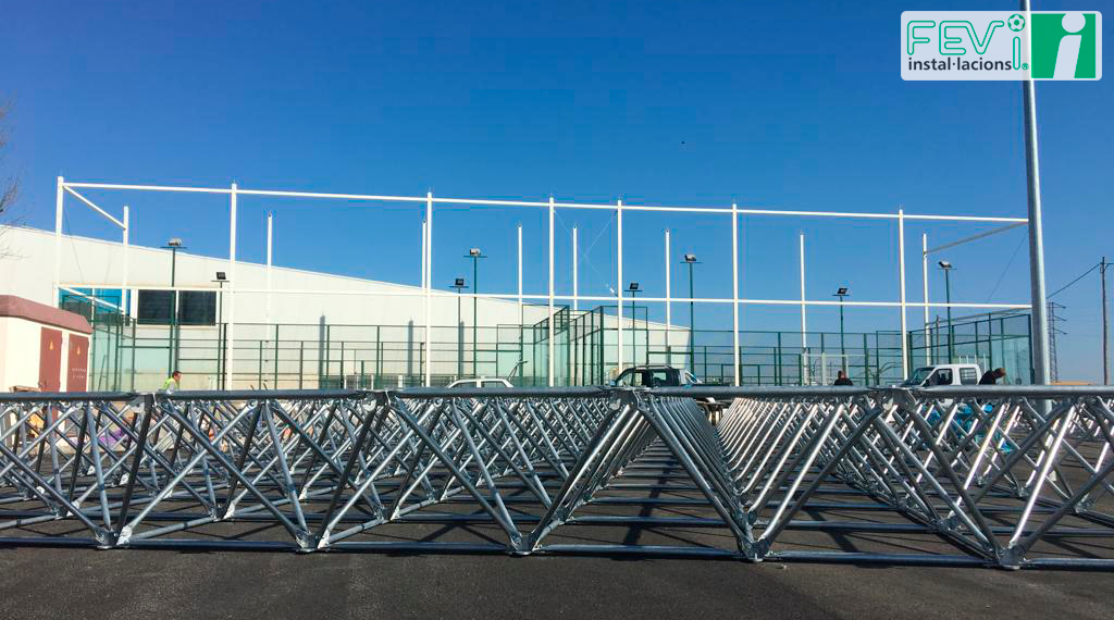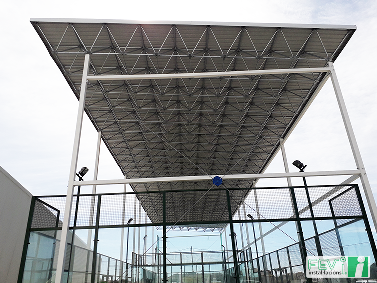 Ésta estructura y cubierta la hemos instalado en el “Centre Esportiu del Delta”de Deltebre (Tarragona) sobre dos pistas de pádel ya existentes. Se trata de un sistema ligero sin soldadura, económico y rápido , donde la cubierta se monta en el suelo y se eleva en una sola pieza. El techo consta de piezas modulares de 1m. y 3 kg. , que en conjunto pueden alcanzar hasta 30 m y soportar cargas de 200 kg./m2. El material está 100% galvanizado en caliente y es 100% reciclable.